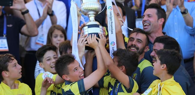 Los niños del Villarreal levantan el título junto a su entrenador / FUNDACIÓN EL LARGUERO
