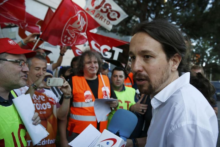 Pablo Iglesias saludando a los trabajadores que se manifiestan frente al Palacio