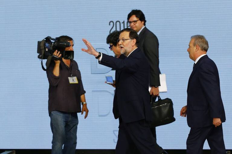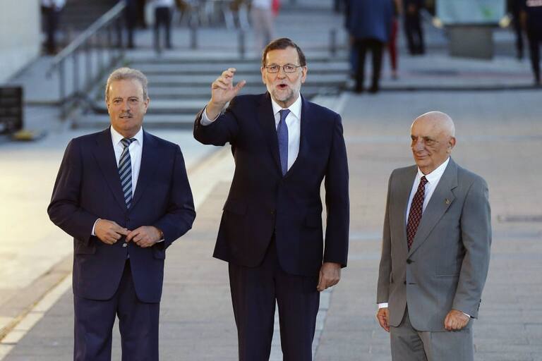 El presidente del Gobierno en funciones y del PP, Mariano Rajoy, acompañado por el presidente de la Academia de la Televisión, Manuel Campo Vidal , y el realizador Fernando Navarrete a su llegada al Palacio Municipal de Congresos de Madrid