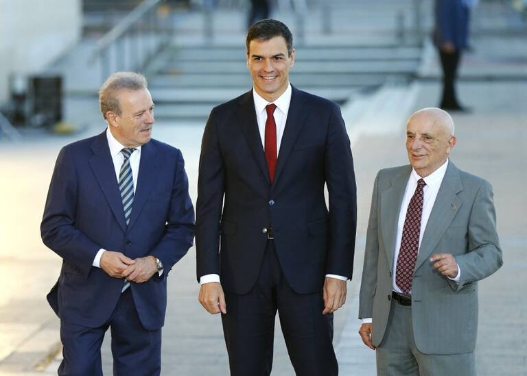 El líder del PSOE y candidato a la Presidencia del Gobierno, Pedro Sánchez, acompañado por el presidente de la Academia de la Televisión, Manuel Campo Vidal , y el realizador Fernando Navarrete, a su llegada al Palacio Municipal de Congresos de Madrid
