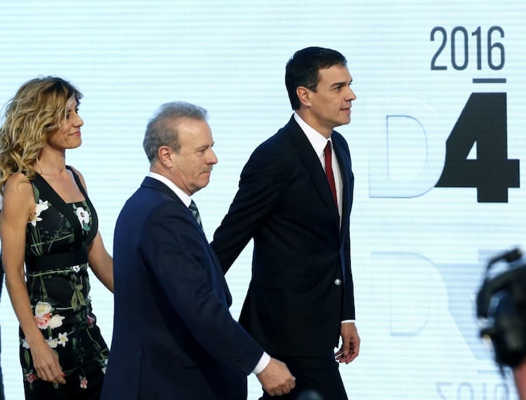 El candidato por el PSOE a la presidencia del Gobierno, Pedro Sánchez, acompañado por su esposa Begoña Gómez y por el presidente de la Academia de la Televisión, Manuel Campo Vidal, a su llegada al Palacio Municipal de Congresos de Madrid