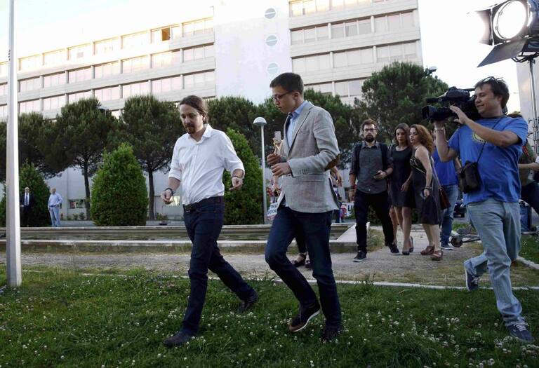 El candidato por Unidos Podemos a la presidencia del Gobierno, Pablo Iglesias , acompañado por el presidente de la Academia de la Televisión, Manuel Campo Vidal, y el realizador Fernando Navarrete, a su llegada al Palacio Municipal de Congresos de Madrid