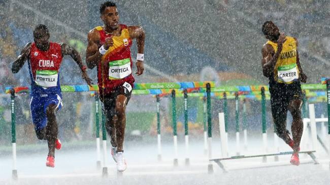 Sobre la pista anegada, Ortega se impuso con una marca de 13.32, mientras el jamaicano Deuce Carter, que partía con la segunda marca, se quedó fuera al tropezar con un obstáculo.