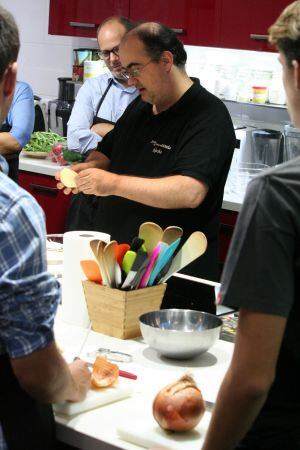 El cocinero dedica la primera hora del curso hablar del tamaño de las ollas, de por qué conviene "dejarse la pasta" en sartenes o de por qué es desaconsejable tener un cuchillo jamonero en un hogar con niños. También reivindica la vigencia del pasapurés y muestra en qué se diferencia un corte mirepoix de una brunoise o una juliana.