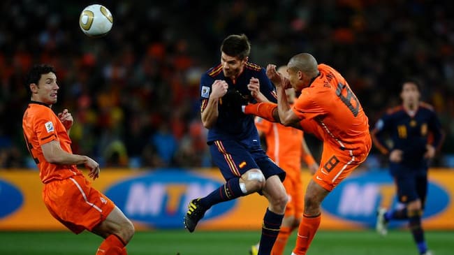 Todo ocurrió mediado el primer tiempo de la final. Fue entonces cuando el centrocampista holandés, por aquel momento en las filas del Manchester City, realizó una fea entrada sobre Alonso, al que clavó los tacos en el pecho sin el balón de por medio.