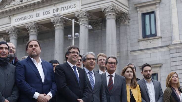 GRA287. MADRID, 22/11/2016.- El portavoz de PDECat, Francesc Homs (4i), acompañado del diputado de Junts pel Sí en el Parlament Lluis LLach (i); el vicepresidente de la Generalitat de Cataluña, Oriol Junqueras (2i); el presidente, Carles Puigdemont (3i); / Kiko Huesca