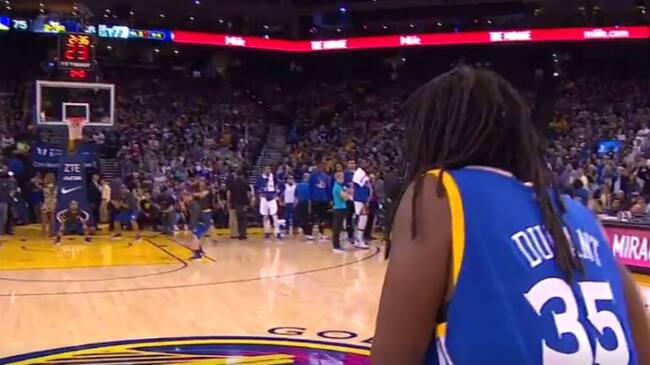 El aficionado, vestido con una camiseta de la estrella de los Warriors Kevin Durant, miró a la canasta, tomó carrerilla, botó el balón con una mano y al llegar a la divisoria del campo efectuó un lanzamiento impecable. No paró de recibir abrazos después del logro.