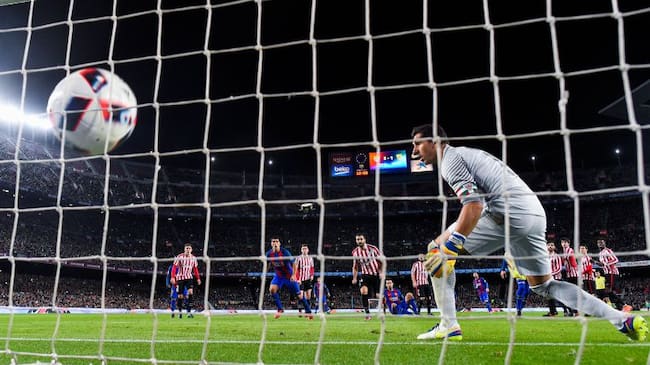El argentino en esta ocasión mira a la izquierda, donde está Gorka, pero el portero no se va a dejar engañar, espera el disparo por la deracha. Cuando Messi golpea la bola, Gorka da dos saltitos a la derecha, preparándose para volar esta vez con fuerza para despejar.