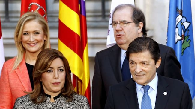 La presidenta de Andalucía, Susana Díaz (primera fila-i), el presidente de Asturias, Javier Fernández (primera fila-d), la presidenta de la Comunidad de Madrid, Cristina Cifuentes (segunda fila-i), y el presidente de Castilla y León, Juan Vicente Herrera / Sergio Barrenechea (EFE)