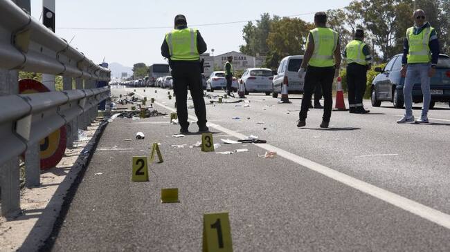Agentes de la Guardia Civil supervisan el lugar en el que una mujer atropelló con su coche a un grupo de seis ciclistas(EFE)
