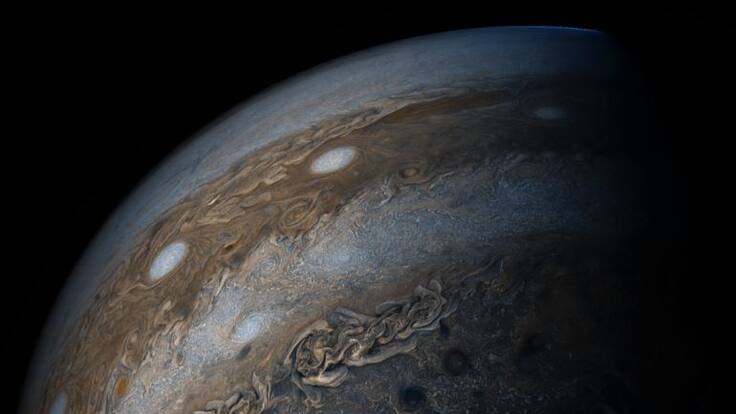 La nave espacial Juno de la NASA se alejaba de Júpiter tras su séptimo paso cerca del planeta cuando el instrumento JunoCam sacó una imagen el pasado 19 de mayo de 2017, a 46.900 kilómetros sobre las nubes. En ella se puede vislumbrar las diferencias de color, mostrando la increible variedad en la atmósfera tormentosa de Júpiter.