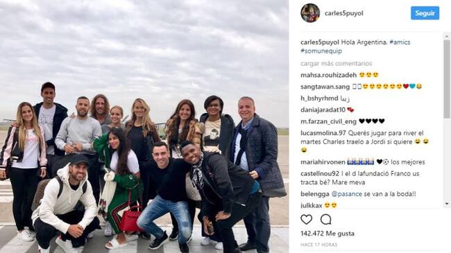 La instantánea más repetida hasta ahora es una foto de Jordi Alba, Xavi Hernandez, Carles Pujol, Samuel Eto'o y Cesc Fábregas con sus parejas a la llegada a Rosario. Varios de los jugadores la han compartido en sus perfiles con todo tipo de mensajes como: "Hola Argentina" o "La primera expedición ya ha aterrizado en Rosario. #equipomixto".