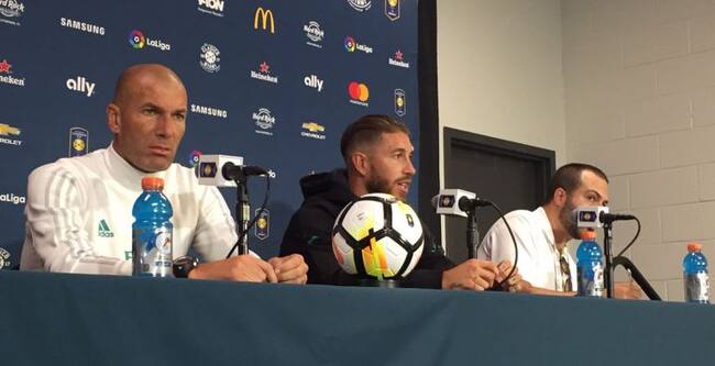 Zinedine Zidane y Sergio Ramos, durante la rueda de prensa previa al Clásico (Miami) / Antón Meana