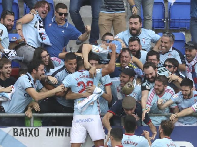 Cabral celebra un gol junto a los aficionados celtiñas / Javier Etxezarreta (EFE)