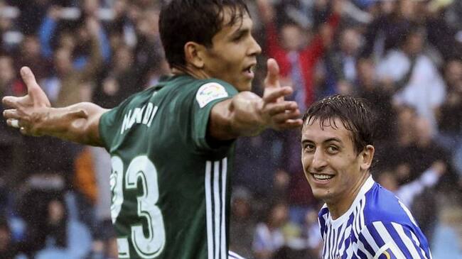Oyarzabal sonríe ante la mirada de un jugador del Betis / Javier Etxezarreta (EFE)