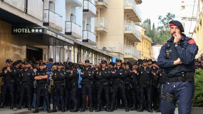 Un mosso y un grupo de policías nacionales, frente a un hotel de Pineda de Mar. / Albert Gea (REUTERS)