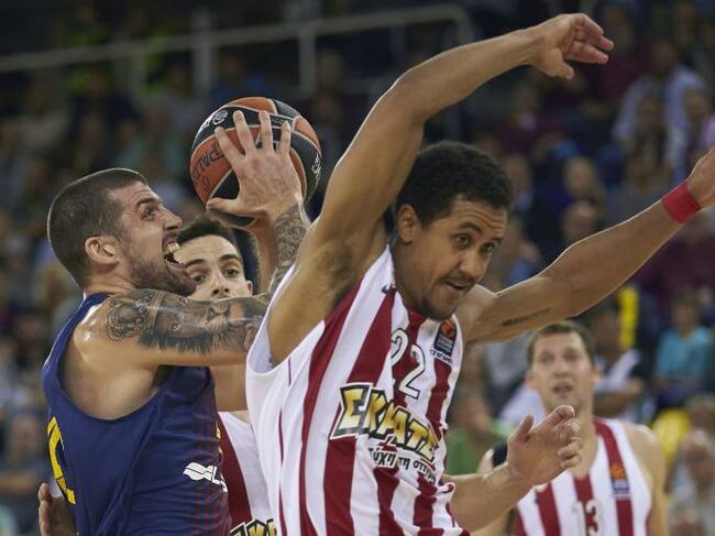 El alero del FC Barcelona Lassa Adrien Moerman entra a canasta ante Brian Roberts, de Olympiacos / Alejandro García (EFE)