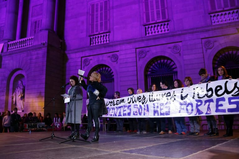 La coreógrafa Sol Picó y la actriz Júlia Barceló leen en la plaza Sant Jaume en manifiesto de la manifestación.