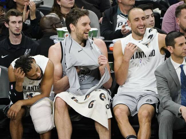Ginóbili y Pau Gasol sonríen en el banquillo de los Spurs / Darren William Abate (EFE)