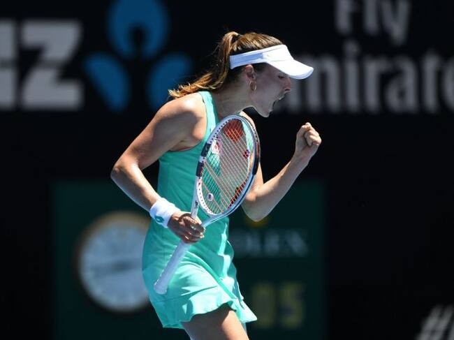 Alize Cornet celebra un punto contra la belga Elise Martens durante su partido de la segunda ronda del Abierto de Australia disputado / JOE CASTRO (EFE)