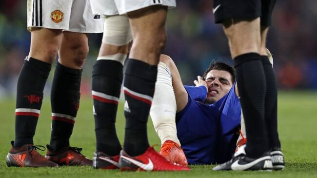 Álvaro Morata se duele tras un golpe en un partido ante el United / Getty