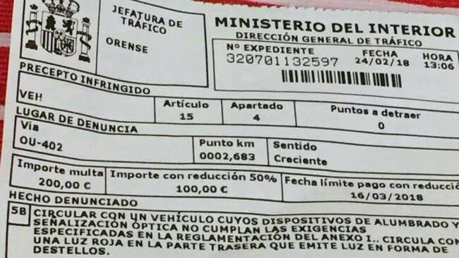 La multa se colgó en un conocido foro de ciclistas y rápidamente se ha extendido como la espuma. En ella se ve una notificación oficial que comunica una sanción de 200 euros (100 en caso de pagar antes de plazo), el motivo que aporta es la circulación con unos dispositivos de alumbrado que no cumplen con las exigencias especificadas. Traducido al castellano, que la luz era intermitente en lugar de fija.