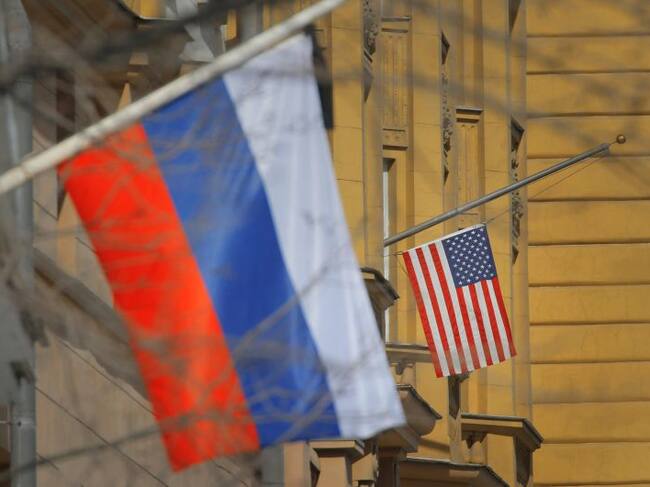 La bandera rusa y la estadounidense ondean en la Embajada estadounidense en Moscú (Rusia) / YURI KOCHETKOV (EFE)