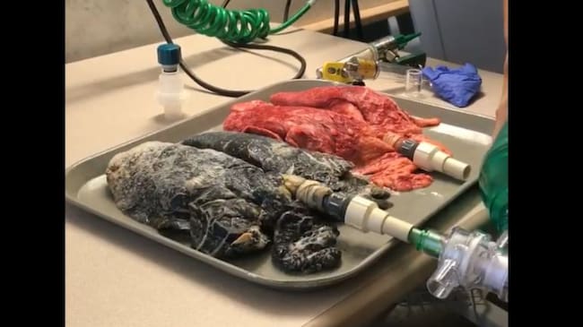 En este vídeo, la enfermera nacida en Carolina del Norte compara unos pulmones sanos de alguien que no ha fumado en su vida con los de una persona que fumaba un paquete de cigarrillos a diario durante los últimos 20 años. Mientras que los primeros muestran un color rojizo, los del fumador a tiempo completo muestran un poco saludable color negro por culpa del cáncer.