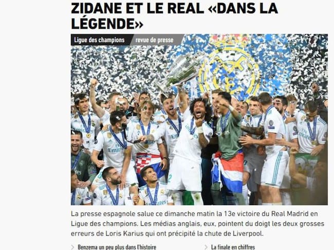 El rotativo deportivo L'Équipe destacó en portada el gol de chilena del galés Gareth Bale -"La plus Bale"- y consideró que la de anoche ante el Liverpool se trata de una victoria para "la eternidad". "Veinte años después de darle a Francia su único Mundial (como jugador), Zinedine Zidane se ha convertido en el primer entrenador en llevarse tres Ligas de Campeones seguidas", comentó el diario.