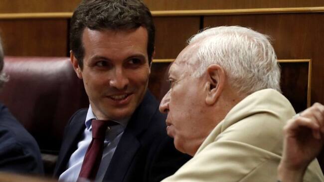 El candidato a la presidencia del Partido Popular Pablo Casado, conversa con el exminitro de Asuntos Exteriores José Manuel García-Margallo. / Kiko Huesca (EFE)
