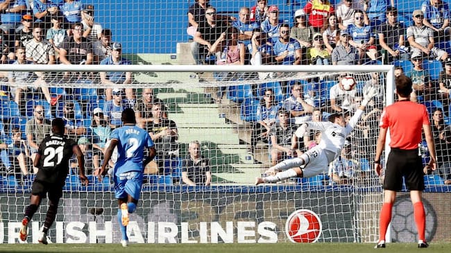 El portero del Getafe David Soria encaja el primer gol ante el Levante, obra del centrocampista macedonio Enis Bardhi / MARISCAL (EFE)