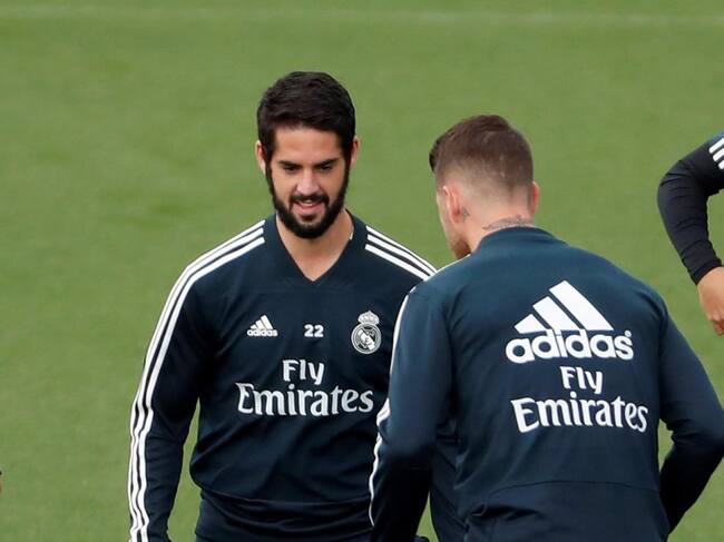Isco y Ramos tocan balón en el último entrenamiento previo al partido contra el Levante / Chema Moya (EFE)