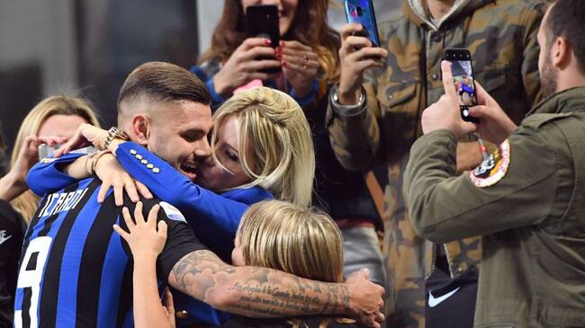 Icardi celebró con su familia el gol de la victoria en el derbi de Milán. / DANIEL DAL ZENNARO (EFE)