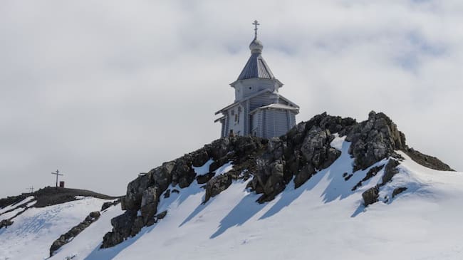Iglesia de madera en la estación antártica rusa de Bellingshausen. / Getty Images