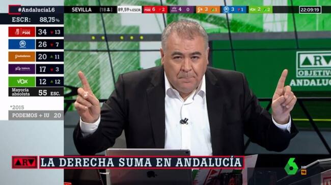 El resultado de las elecciones autonómicas de Andalucía agitó drásticamente el prime time, el horario de máxima audiencia. Cumpliendo con todos los pronósticos, laSexta se impuso claramente como la oferta preferida de la audiencia gracias al especial electoral que llevó a cabo el programa 'Al rojo vivo'. En concreto, el espacio de actualidad, bajo el título 'Objetivo Andalucía', firmó un gran 14,2% de cuota de pantalla con más de 2,5 millones de espectadores.