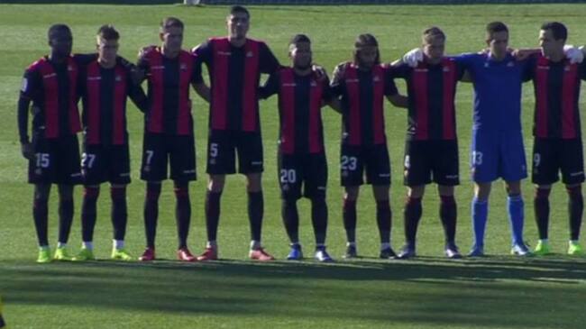 Los jugadores del Reus permanecen inmóviles durante el primer minuto del encuentro ante el Alcorcón(Twitter)