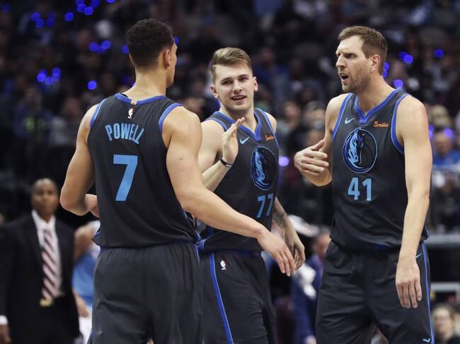 Doncic celebra con Nowitzki y Powell, la pasada semana en el partido contra Sacramento / Kevin Jairaj (USA TODAY Sports)