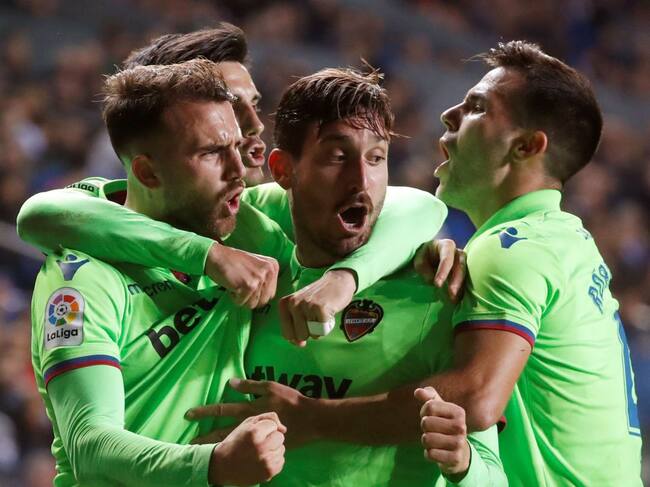 Los jugadores del Levante celebran el gol del empate en Anoeta / Juan Herrero (EFE)