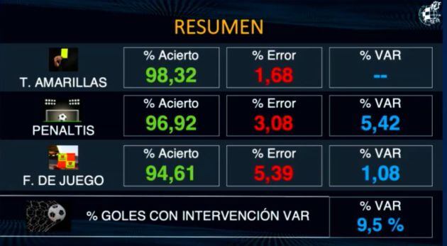 Respecto a la temporada pasada, los penaltis pasaron de 113 a 130 (+17%), las amonestaciones por protestas se redujeron de 266 a 220 (-46%) y las amonestaciones por simulaciones pasaron de 19 a 6 (-13%), según los datos que ha hecho públicos el responsable del proyecto VAR, Carlos Clos Gómez.