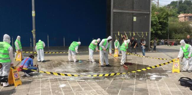 Al finalizar el acto electoral, un grupo de personas ataviadas con chalecos en los que se podía leer "Viva el pueblo vasco" han "desinfectado" la zona.
