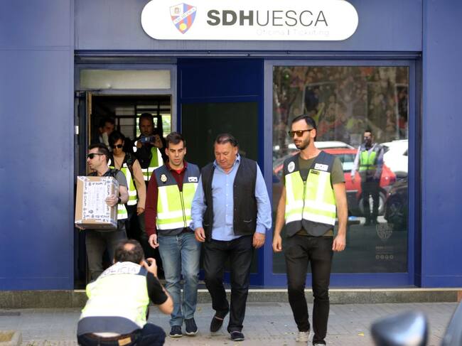 El presidente del Huesca Agustín Lasaosa sale arrestado de las oficinas del Huesca el pasado martes / Alvaro Jesus Calvo Lopez/Getty Images