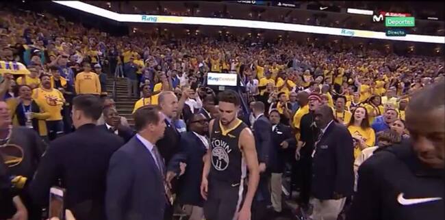Porque Klay Thompson tenía dos tiros libres por lanzar y si no los lanzaba en ese momento no podría volver a la pista más adelante. Por ello, cuando estaba ya en los vestuarios, el 11 de los Warriors se dio media vuelta y salió de nuevo a pista llevándose una ovación atronadora.