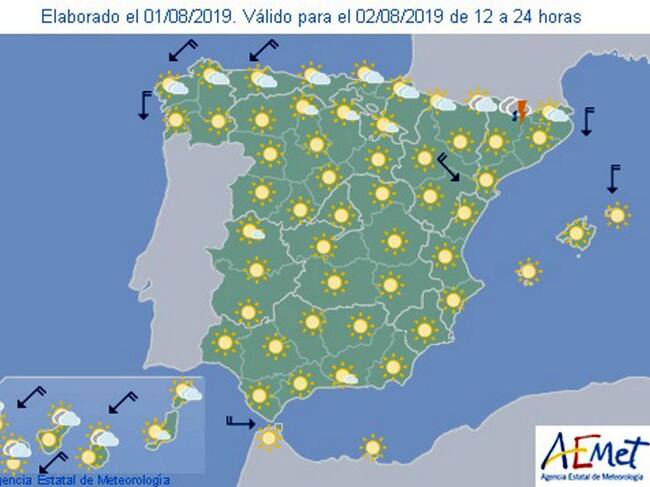 Predominio de cielo despejado en general. En el tercio norte, intervalos nubosos con nubosidad de evolución diurna que no se descarta que dé lugar a chubascos y tormentas dispersas por la tarde en zonas altas del Pirineo. Temperaturas mínimas sin cambios y máximas con pocos cambios con algún ascenso local en el Ampurdán y el sur de Tarragona. Viento variable flojo tendiendo a sur o sureste flojo, con intervalos de noroeste moderado en el litoral norte de Girona.