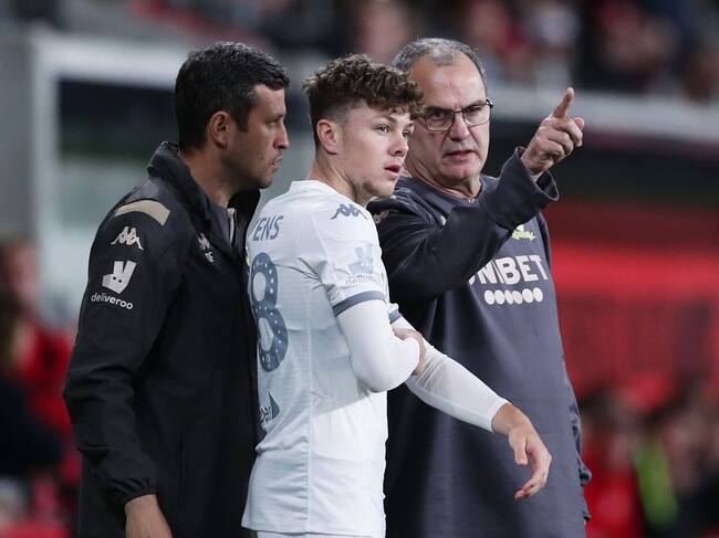 Jordan Stevens y Marcelo Bielsa durante un partido del Leeds. / Getty Images