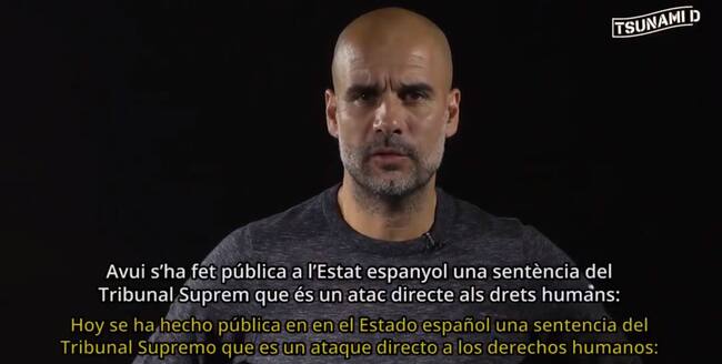Pep Guardiola, entrenador catalán del Manchester City, ha ofrecido su punto de vista a través de un comunicado oficial en un vídeo difundido por la plataforma originada este lunes "Tsunami Democràtic". Dicho comunicado ha sido televisado por la BBC.
