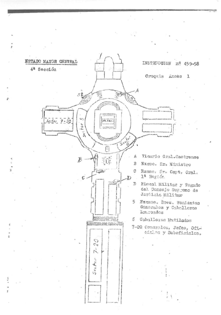 Croquis de basílica del Valle de los Caídos en el que se aprecia el lugar donde se debían colocar los militares que acudieron a la ceremonia de inauguración del monumento.