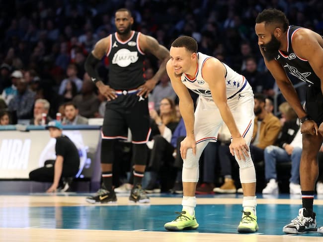 LeBron, Curry y Harden, en el último partido de las estrellas de la NBA. / Getty Images
