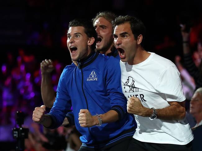 Thiem, Tsitsipas y Federer durante la Laver Cup. / Julian Finney (Getty Images)