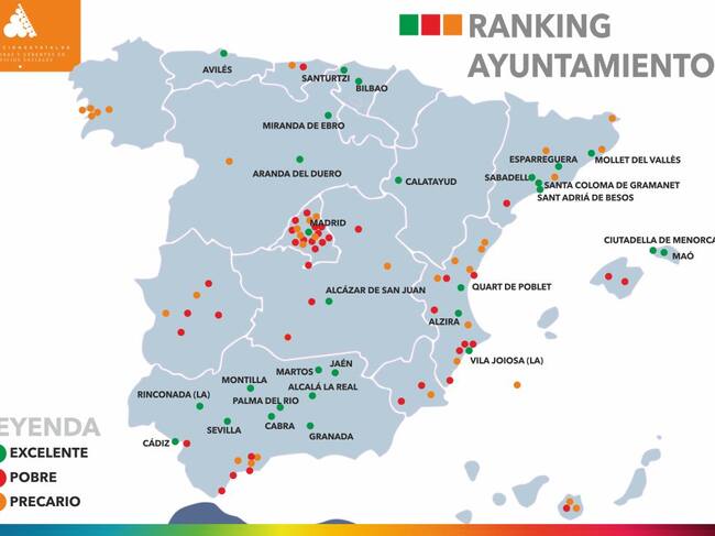 El mapa elaborado por la Asociación de Directoras y Gerentes de Servicios Sociales sobre los presupuestos que los ayuntamientos de más de 20.000 habitantes dedican a la partida de servicios sociales y promoción social. / CADENA SER
