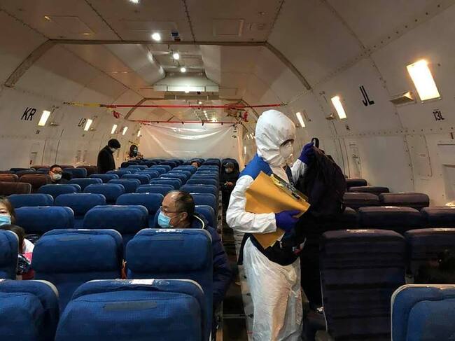 El personal de la embajada de EEUU camina en un avión de carga para evacuar a estadounidenses y canadienses de China / EDWARD WANG (via REUTERS)